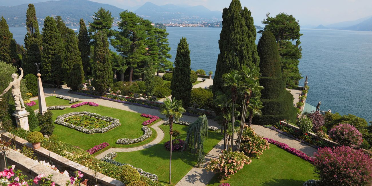 Al sommo svetta il liocorno dei Borromeo, candide pavoncelle s’aggirano tra le fioriture di azalee, di rododendri, di camelie, di oleandri e fra preziosi esemplari di piante, dalle terrazze il panorama è stupendo.